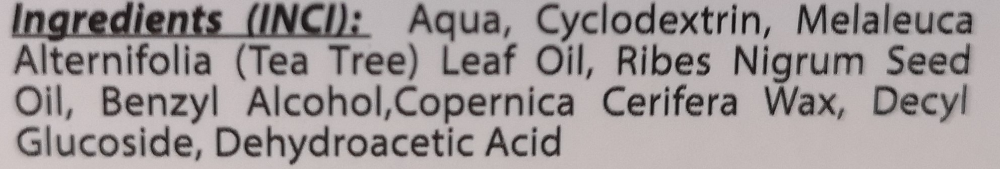 Glavne sestavine: ciklodekstrin, olje avstralskega čajevca, olje iz črnega ribeza.