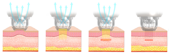 Načelo RF frakcijskega sistema: Energija segreva dermis skozi konice igel, kar spodbuja proliferacijo kolagena in prerazporeditev elastičnih vlaken za pomlajevanje in posvetlitev kože. Tako je RF zelo ciljno usmerjen, specifičen za simptome in ima dovolj energije.