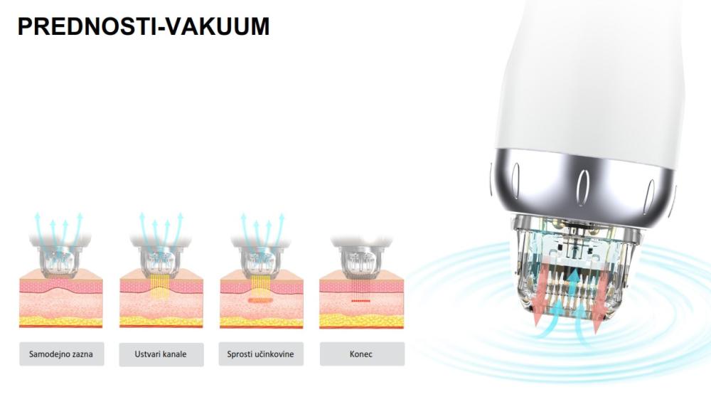 V Vacuum RF Fractional System je dodana vakuumska tehnologija, ki temelji na RF. Kožo absorbira vakuumski sistem, nato se energija dovaja z iglanjem, kar pomaga preprečiti neenakomerno energijo, ki nastane zaradi različne globine vboda igle v kožo zaradi elastičnosti kože. Tako je učinek vakuumskega RF boljši od običajnega RF.