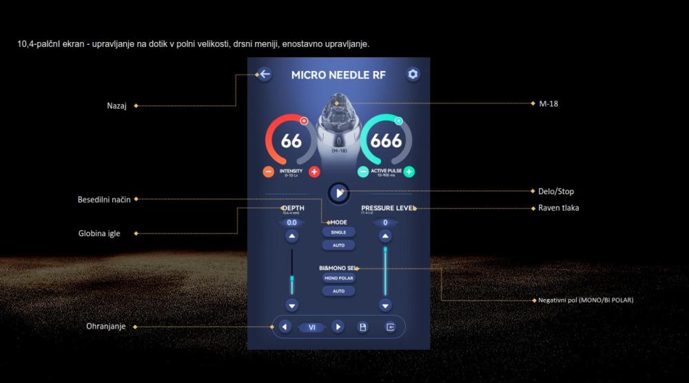 1. Mikroneedling: Ta del aparata vključuje več sterilnih, finih igel, ki se hitro premikajo navzgor in navzdol ter ustvarjajo kontrolirane mikropoškodbe na površini kože. Te mikropoškodbe sprožijo naravni proces celjenja ran, kar spodbudi proizvodnjo kolagena in elastina. Rezultat tega je izboljšana tekstura kože, zmanjšanje gubic, zmanjšanje brazgotin in povečanje čvrstosti kože.