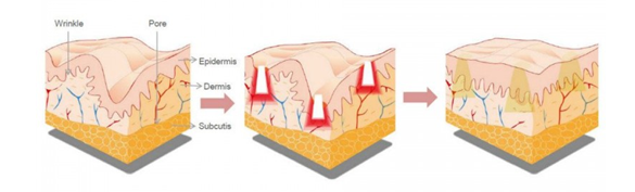 Frakcionirana radiofrekvenca v koži povzroči majhne termične poškodbe v obliki vzorca mikro elektrod na terapevtski glavi. V okolici mikro poškodb koža ni prizadeta, kar predstavlja skladišče celic, ki pospešijo in spodbudijo varno in hitro celjenje poškodb. Frakcionirana radiofrekvenca tako poveča učinkovitost samoobnavljanja in vpliva na hitrejšo obnovo kože v primerjavi z ostalimi neablativnimi in ablativnimi postopki pomlajevanja.