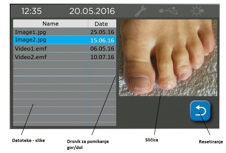 Pregledovalnik lahko uporabite za ogled slik v formatu JPG. Video posnetke lahko predvajate v formatu EMF z USB ključka. Datoteka EMF je posebna oblika datoteke Windows, zasnovana za shranjevanje velike količine slik za visokokakovostno tiskanje Po možnosti, uporabite priložen USB ključ (4 GB). USB ključki drugih proizvajalcev so večinoma kompatibilni z napravo. Vzorčne datoteke so naložene na priloženem ključku. Brisanje teh datotek ne vpliva na delovanje naprave. Upoštevajte, da je lahko največ 100 datotek v imeniku za pregledovalnik slik. Shranjevanje nad 100 datotek ni možno. V primeru, da boste želeli shranti več, kot 100 slik boste morali nekaj slik oz datotek prej izbrisati ali pa shraniti na drug medij kot npr.; USB ključ, v oblak, CD ipd..