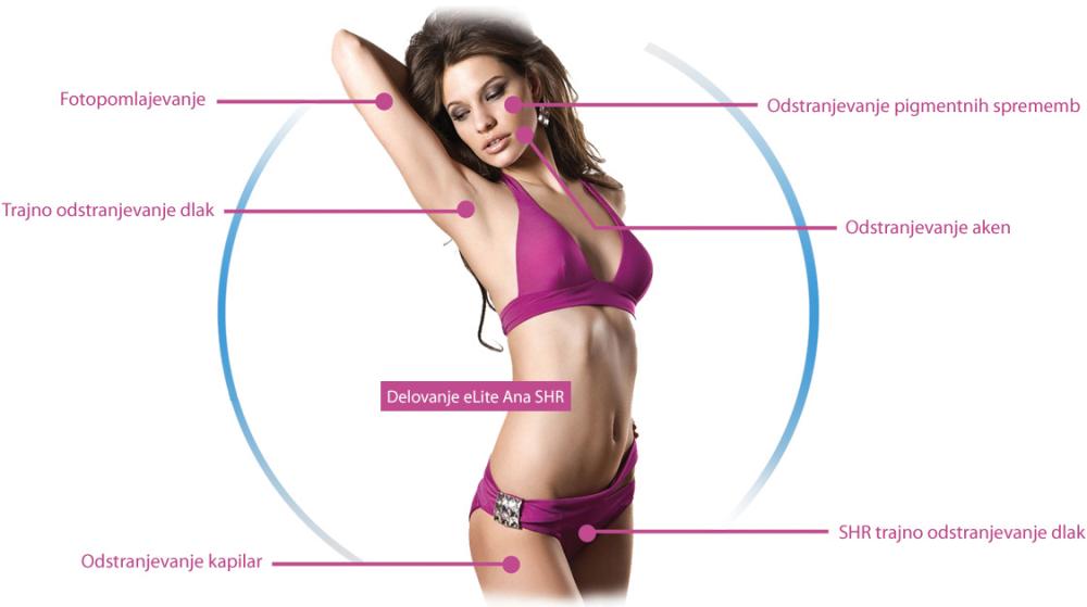 eLite Ana SHR IPL+RF v zgolj eni napravi nudi vse nasledne funkcije: učvrstitev kože, lifting kože, izboljšanje prožnosti in tonusa kože, pomlajevanje kože, odstranjevanje drobnih gubic, fotopomlajevanje, odstranjevanje pigmentnih sprememb, odstranjevanje sončnih peg, odstranjevanje žilnih lezij (teleangiektazij), posvetlitev kože, zmanjšanje velikih por, trajno odstranjevanje dlak in odstranjevanje mozoljev. Hkrati pa izboljša stanje mastne kože.