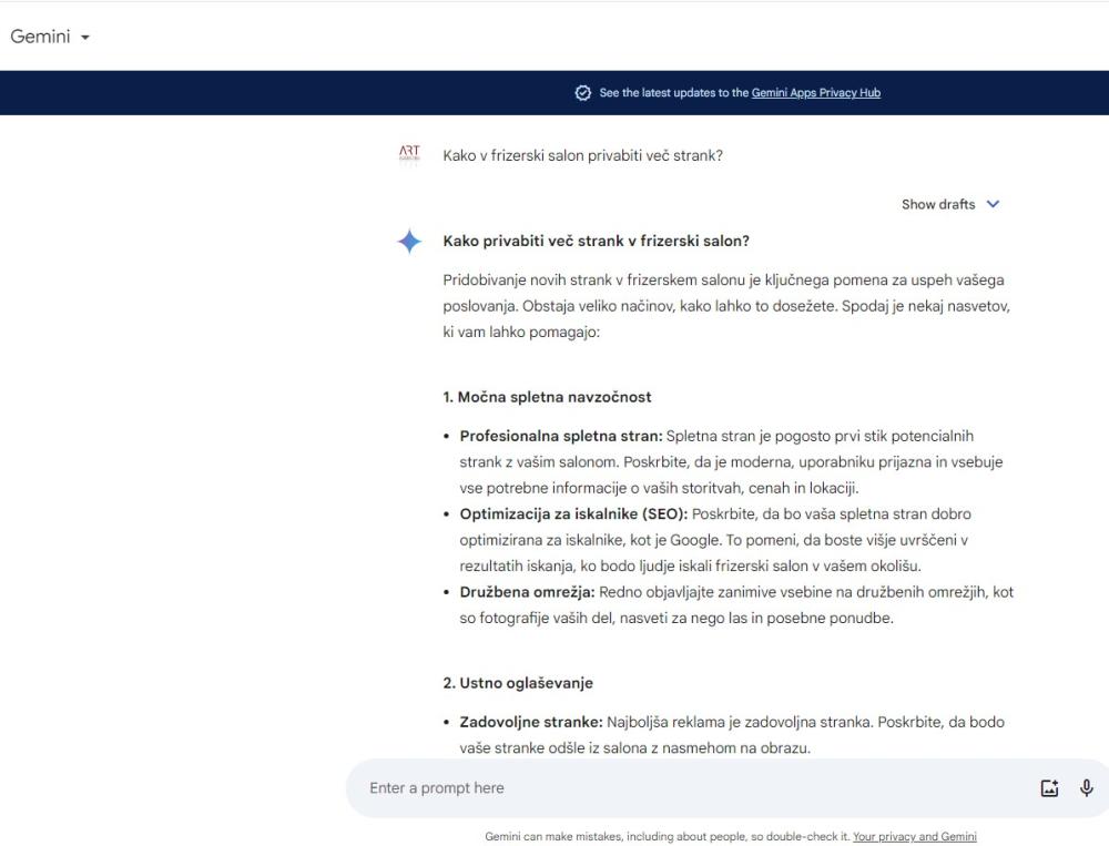 Ko razmišljate o odpiranju salona, imate razna vprašanja in ne veste na koga bi se obrnili za odgovore, da bi dobili verodostojne odgovore! Priporočamo vam, da se obrnete na Googlov program Gemini, ki ga lahko brez težav vprašate kar vas zanima glede poslovanja kozmetičnega salona: "Kakšno izobrazbo potrebujem za odprtje kozmetičnega salona? Kje registriram s.p.? Kaj je bolje s.p. ali d.o.o.? Ali potrebujem računovodjo? Kako v frizerski salon privabiti več strank?" Umetna inteligenca bo prečesala in analizirala ogromne količine podatkov, tako da boste dobili izčrpne informacije in hkrati nasvete kam se obrniti še po več informacij.