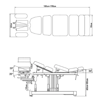 Ta kiropraktična miza je naša nova vrhunska miza. Opremljena je s prestižnim dvižnim stebrom, ki odpravlja potrebo po klasičnem dvižnem mehanizmu. Vsi padci – vratni, prsni, ledveni in medenični – se aktivirajo z nožnim stikalom, kar omogoča enostavno upravljanje za terapevta.