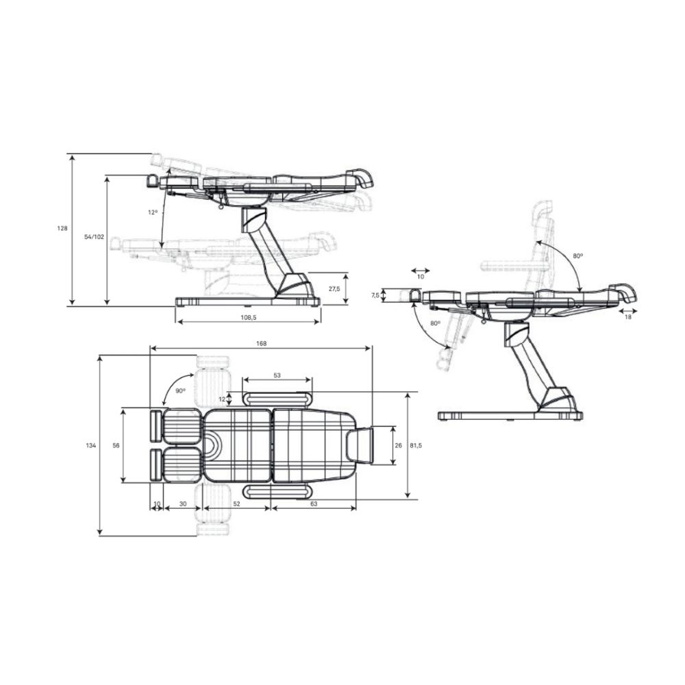 Vrhunski stol za pedikuro, opremljen s 3 motorji, ki nadzorujejo višino, naslonjalo in naklon sedeža.