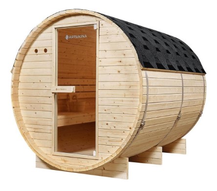 Vključuje 8 KW grelec za savno, 15 kg kamnov za savno, klopi za savno, zajemalko za savno, vedro, peščeno uro, termo-higrometer, LED osvetlitev in bitumenske strešne skodle!